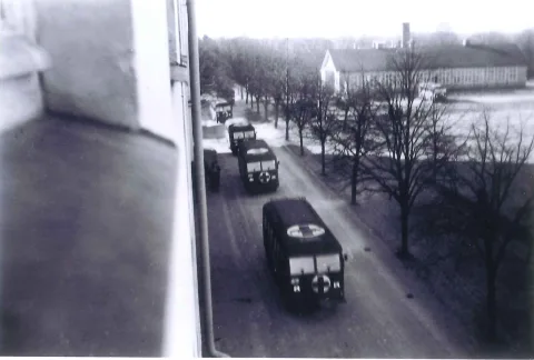 Departure from Hässleholm to Malmö in March 1945, before the buses were painted white.Photo: Ingemar Welff.